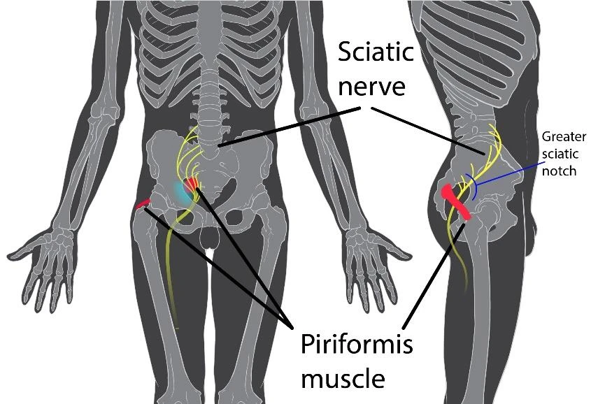 - Piriformis syndrome is a common cause of sciatica as the muscle goes from the sacrum to the femur which directly covers the sciatic nerve. When the muscle gets tight the nerve can get pinched causing the associated symptoms.